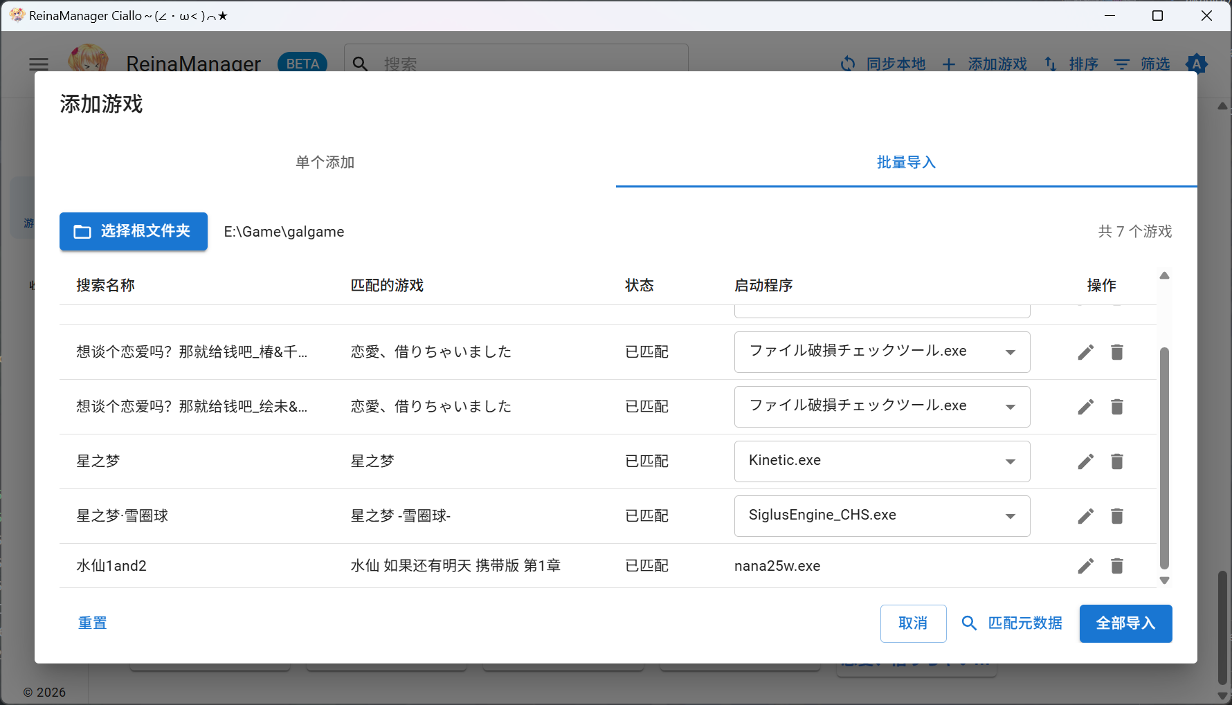 在游戏添加界面点击批量导入,选择一个包含所有游戏文件夹的目录,系统会自动扫描该文件夹下的所有的游戏并列出,确认无误后可以点击匹配元数据,等待匹配完成后,可以手动补充错误或者缺失的部分,还可以修改游戏的启动程序,最后点击全部导入按钮,完成批量导入