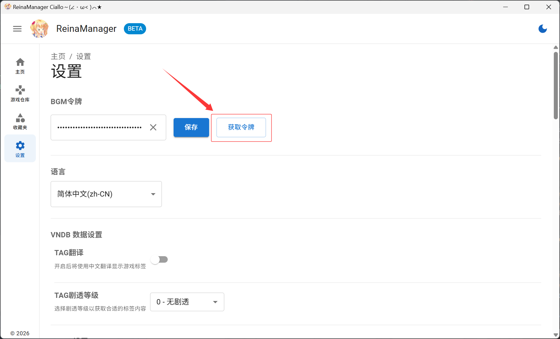Submit按钮,上方会出现一串字符,将它复制下来 - 回到 ReinaManager 设置页面,将复制的字符粘贴到 BGM 令牌输入框中,点击保存